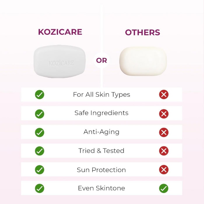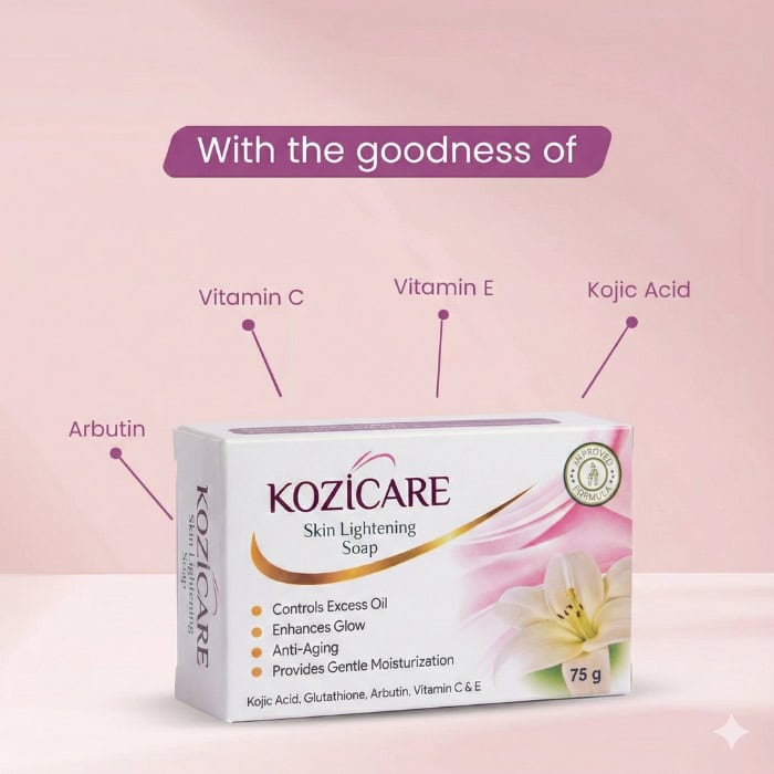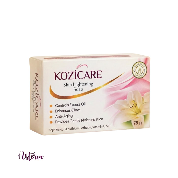 Kozicare Kojic Acid And Glutathione Soap helps lighten dark spots, brighten overall complexion, and promote a smoother, more radiant skin appearance.